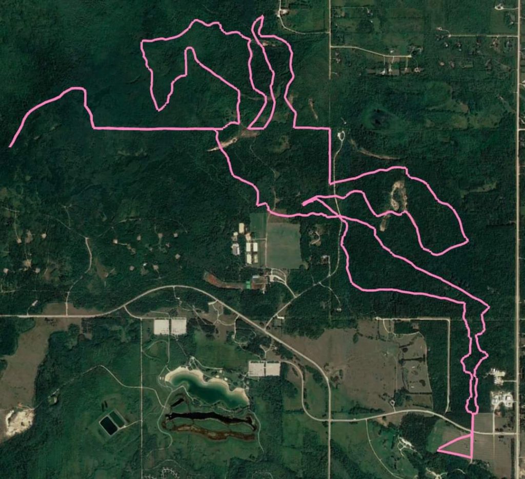Follow the ribbons through the old manure mounds into some grassy and bushy trail and you’ll pop out at an intersection, stay straightish to enter Mosquito Alley. There will be TWO-WAY TRAFFIC here. You’ll find your 10-mile marker on Mosquito Alley.