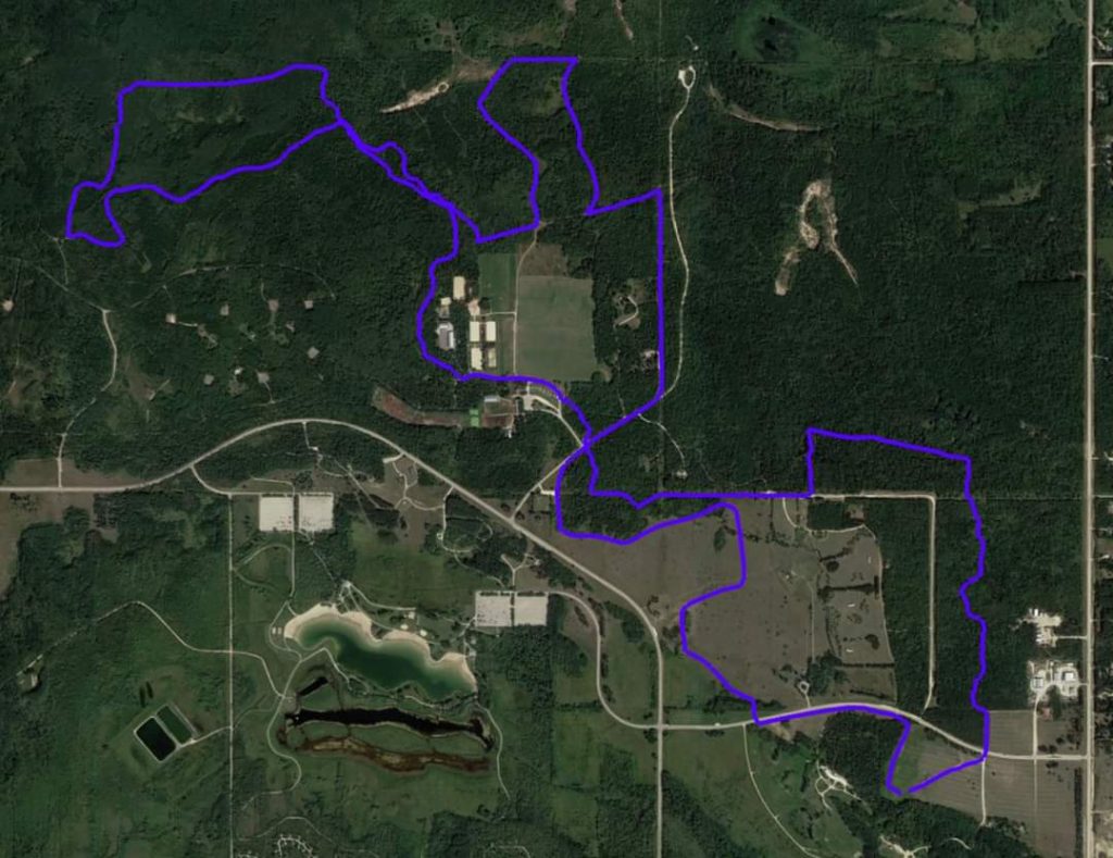 Head east from ride camp, turn left at the gravel road heading North towards Festival Drive cross the paved road and head across the field and into Bridle Path (Horse & Rider on Red markers). You’re going to stay on Bridle Path until it comes to Nimowin Road (no sign here), cross the gravel road and take a slight right to continue following Bridle Path.