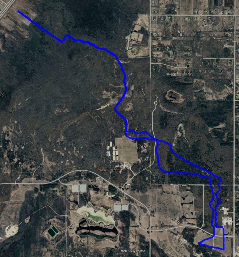 Follow the ribbons through the old manure mounds into some grassy and bushy trail and you’ll pop out at an intersection, stay straightish to enter Mosquito Alley. There will be TWO-WAY TRAFFIC here. You’ll find your 10-mile marker on Mosquito Alley.